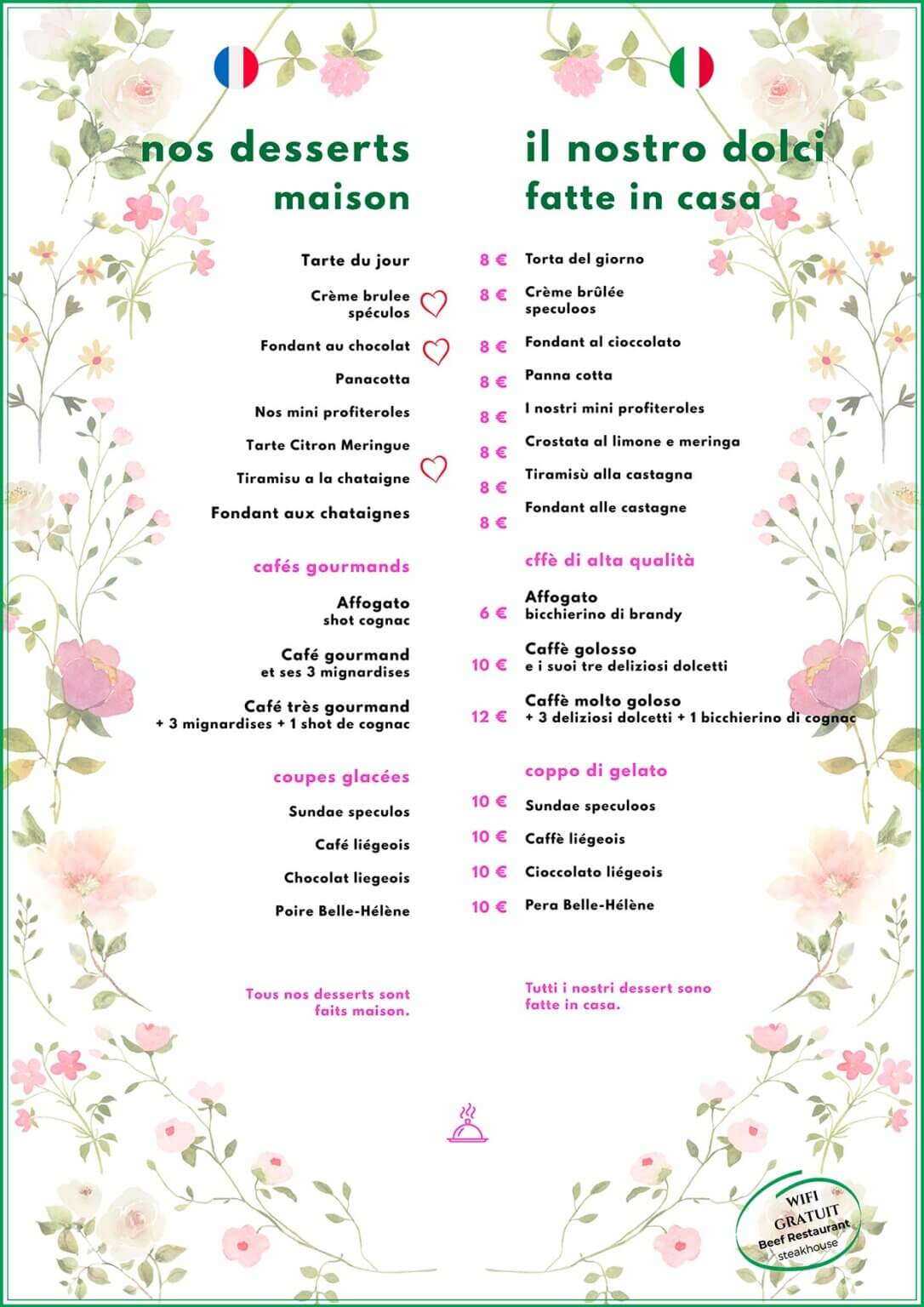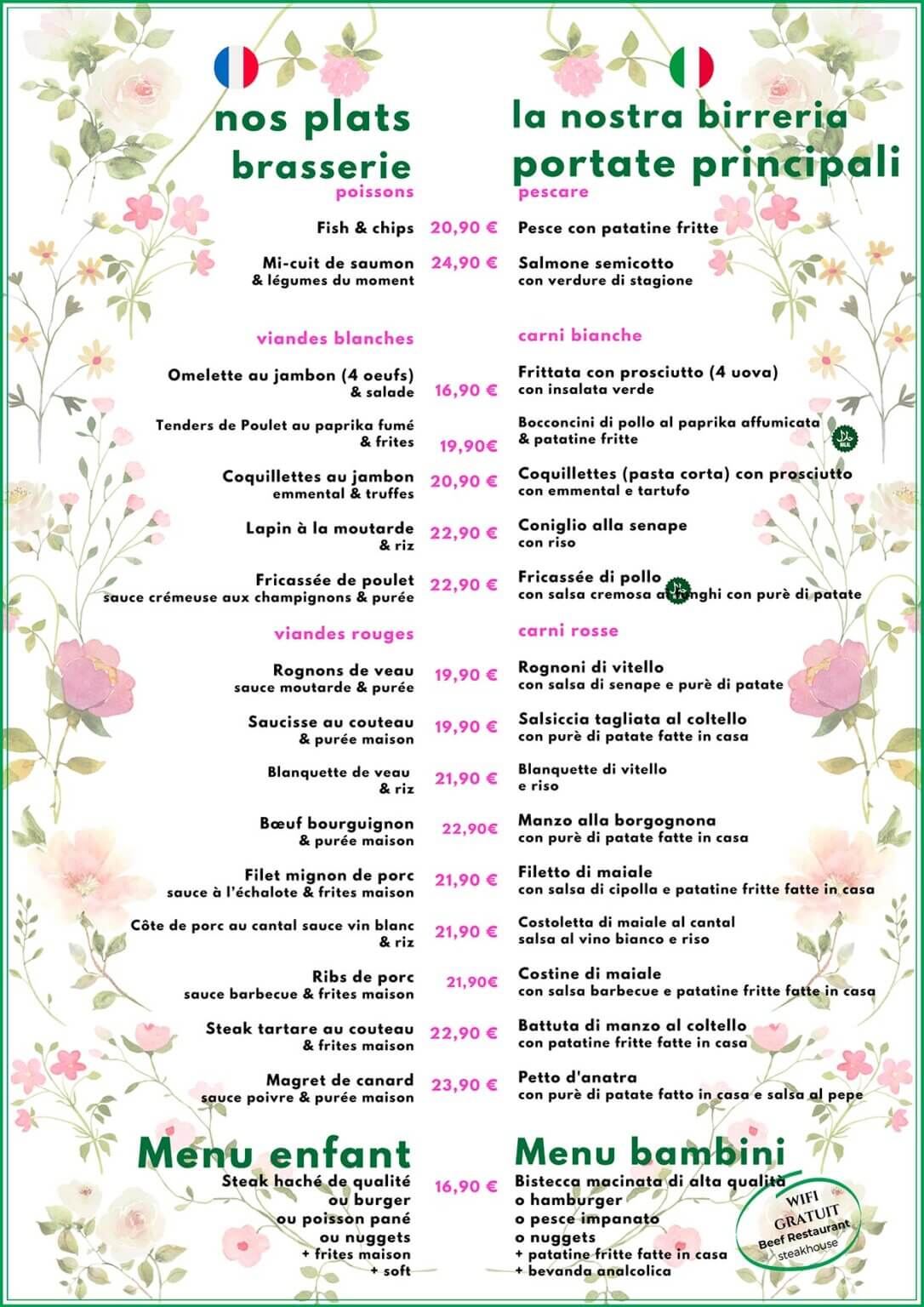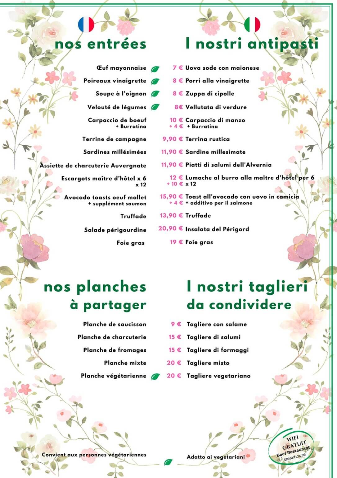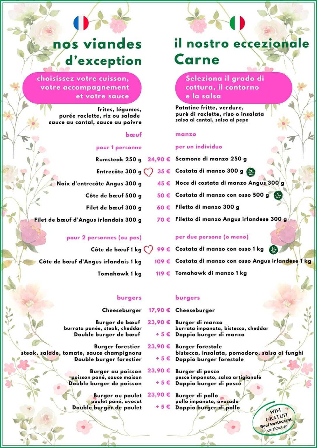 ● Carne bovina di prima qualità: vieni a scoprire la nostra carne eccezionale, frollata per diverse settimane, di qualità superiore e rigorosamente selezionata. Di origine francese, argentina per l'entrecôte o irlandese per la costata. Preparati secondo le tue preferenze culinarie, ogni boccone è un'esplosione di sapori.