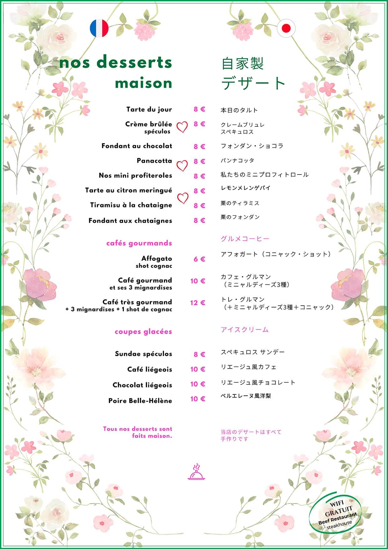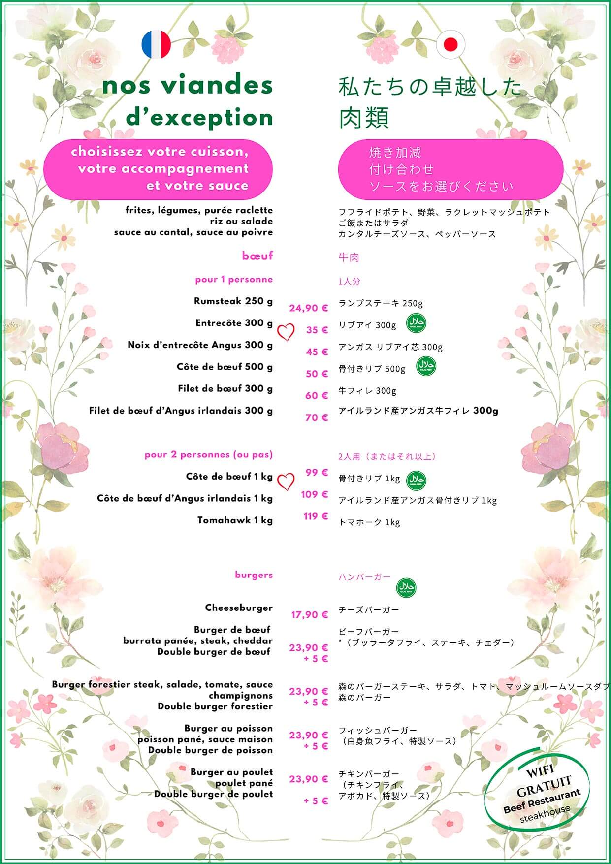 ● Prime beef: come and discover our exceptional meat, matured for several weeks, of superior quality and rigorously selected. Of French origin, Argentinian for the entrecôte or Irish for the prime rib. Prepared according to your cooking preferences, each bite is an explosion of flavors.