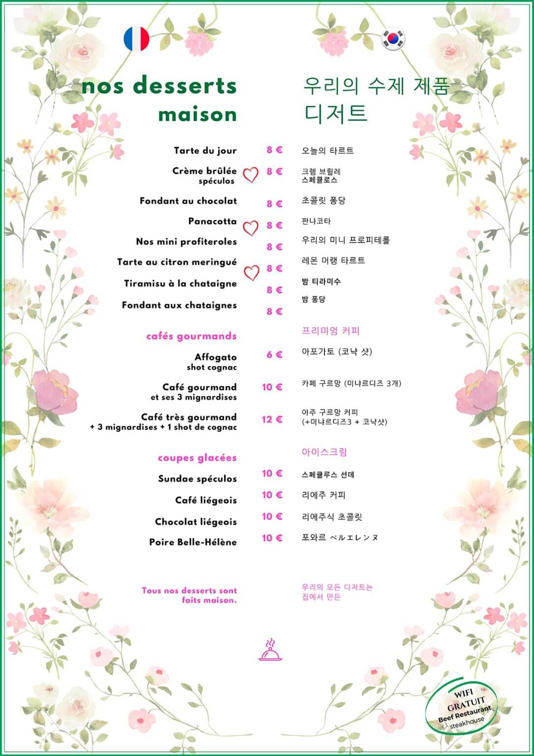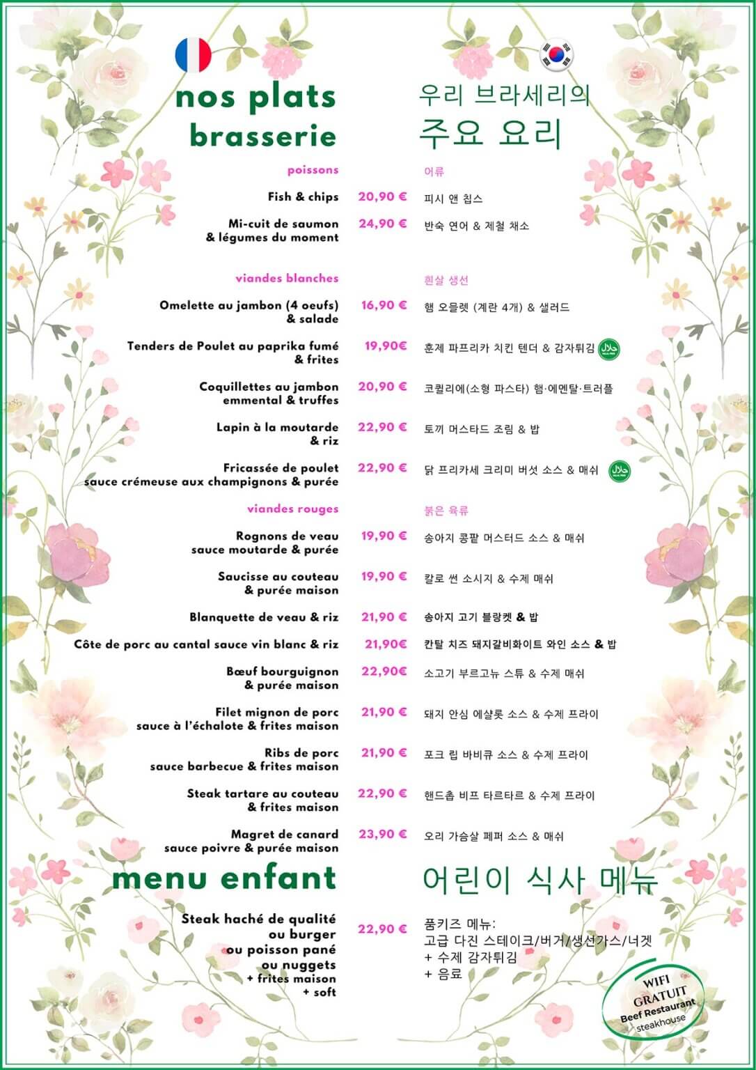 ● Beef, but not only: explore our wide selection. You can find lamb rump steak, wonderful breaded chicken legs, chicken popcorn or our succulent homemade falafels. Each dish is prepared with care and expertise to guarantee an unforgettable taste experience.