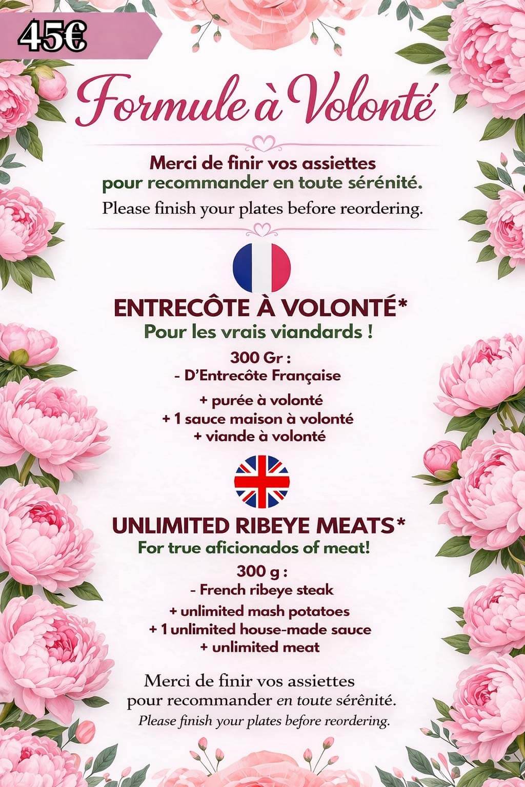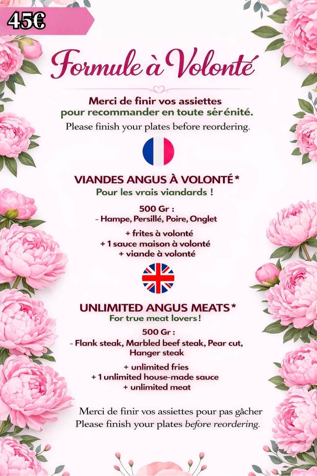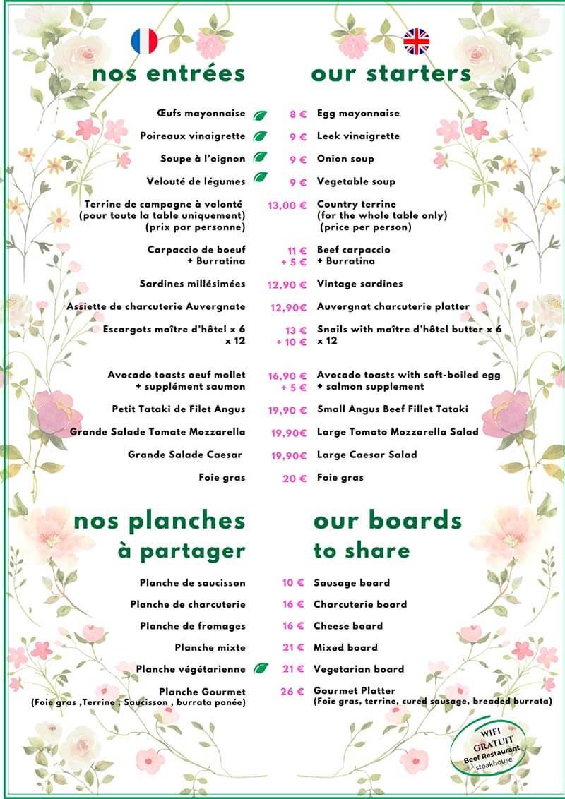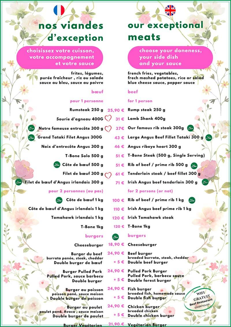 ● Bœuf de premier choix : venez découvrir notre viande d’exception, maturée pendant plusieurs semaines, de qualité supérieure et sélectionnée rigoureusement. D’origine française, argentine pour l’entrecôte ou irlandaise pour la côte de bœuf. Préparés selon vos préférences de cuisson, chaque bouchée est une explosion de saveurs.