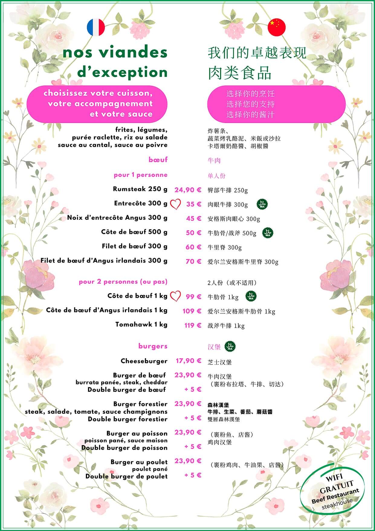 ● Prime beef: come and discover our exceptional meat, matured for several weeks, of superior quality and rigorously selected. Of French origin, Argentinian for the entrecôte or Irish for the prime rib. Prepared according to your cooking preferences, each bite is an explosion of flavors.